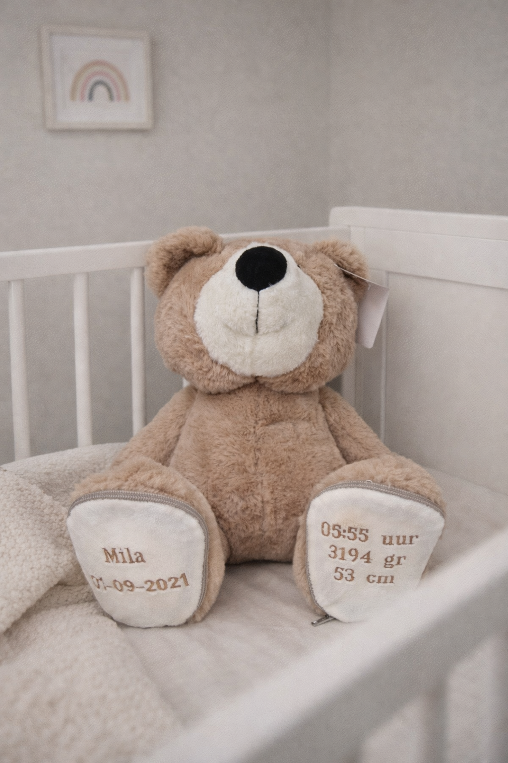 Een zachte geboortebeer met naam en geboortedetails. Een blijvende herinnering!