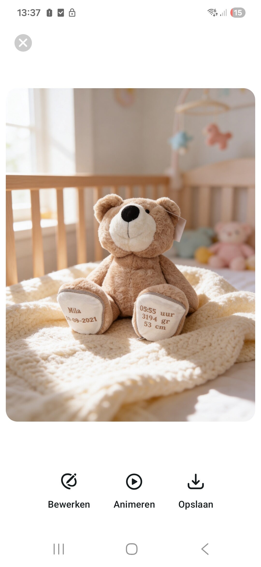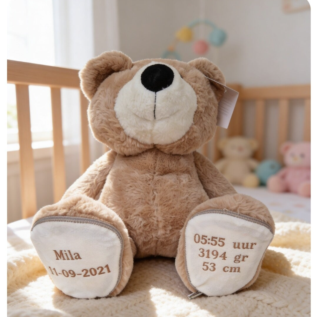 Maak kraammomenten extra bijzonder met een gepersonaliseerde geboortebeer. Deze knuffelachtige teddybeer is niet alleen mega zacht, maar wordt ook zorgvuldig geborduurd met de naam en de geboortedetails . Een cadeau dat generaties lang gekoesterd zal worden.